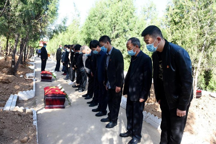 上午9時,入園安葬儀式開始,全體人員肅立,奏唱國歌,向革命烈士默哀。夏縣烈士陵園四周松柏青翠,安放烈士遺骸的棺槨上覆蓋著國旗。現場氣氛莊嚴肅穆,全體人員神情莊重,花籃緞帶上的“革命烈士永垂不朽”字樣熠熠生輝。