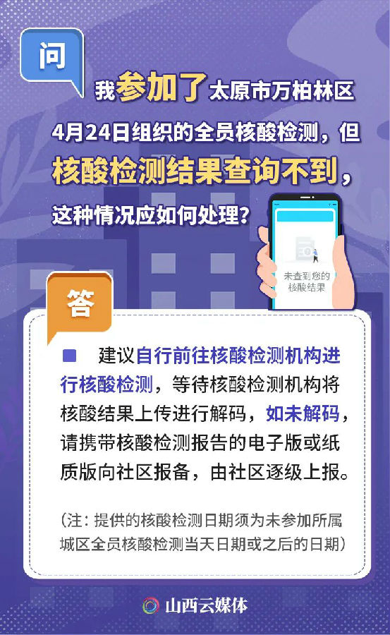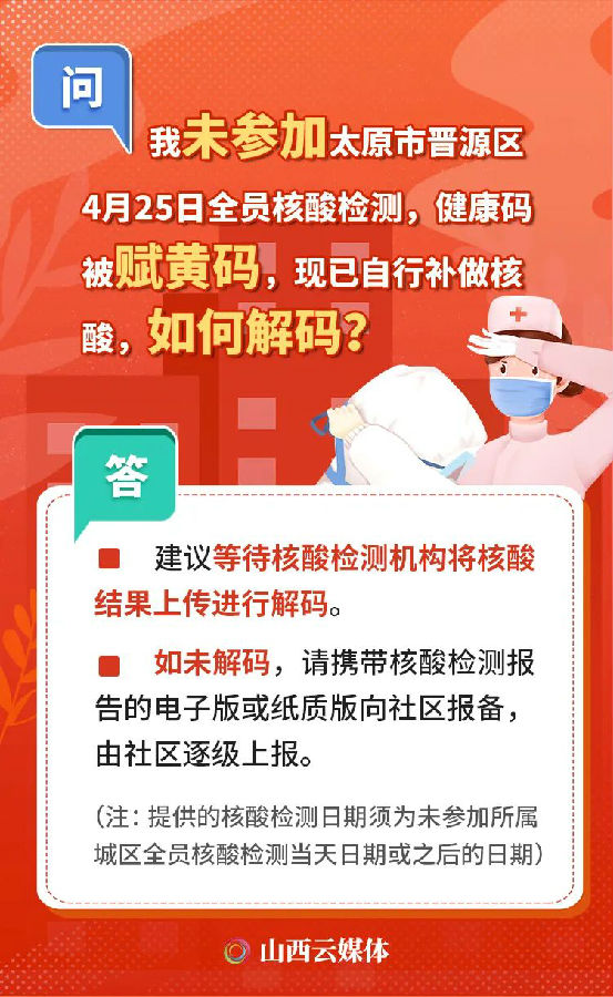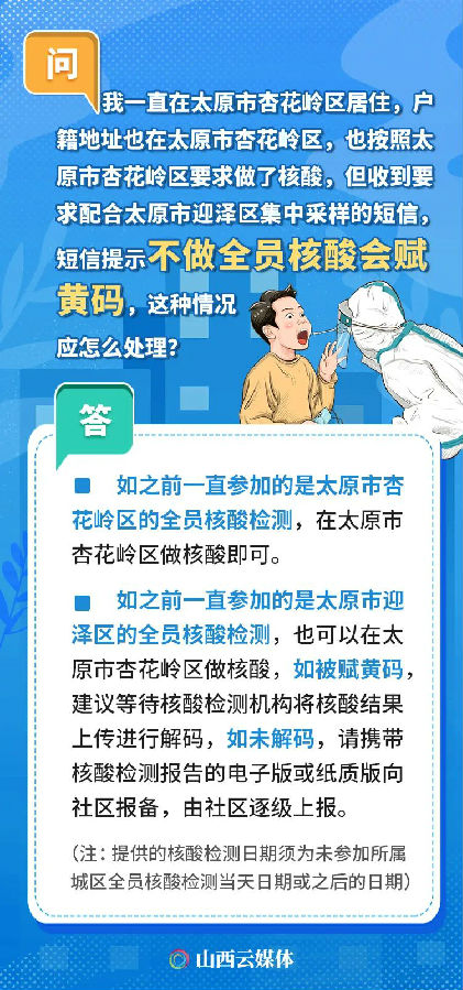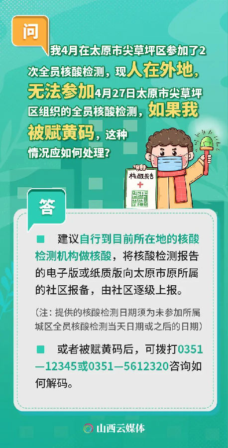 人在外地,無法參加全員核酸檢測,被賦黃碼,怎么辦?自行補做核酸,如何解碼?隨著太原市區域核酸檢測工作的開展,核酸檢測及賦碼的相關情況成為大家關注的話題。近日,太原市12345政務服務便民熱線就民眾關注的相關熱點問題進行了匯總,一起來看!