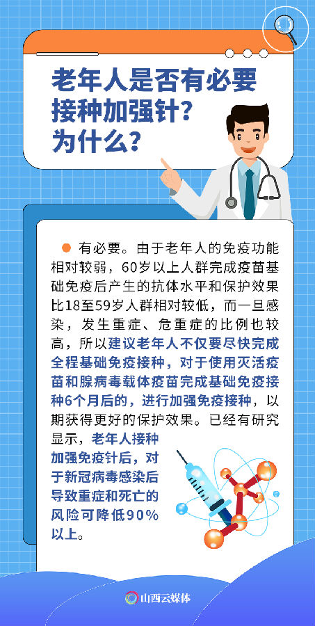 目前疫情防控形勢嚴峻復雜,接種新冠疫苗、做好個人防護仍是疫情防控最主要的措施。60歲以上老年人是新冠肺炎重癥和死亡的高風險人群,沒有禁忌癥、符合接種條件的老年人應盡快接種新冠疫苗。接種程序是什么?注意事項有哪些?是否有必要接種加強針?一組問答帶你了解!