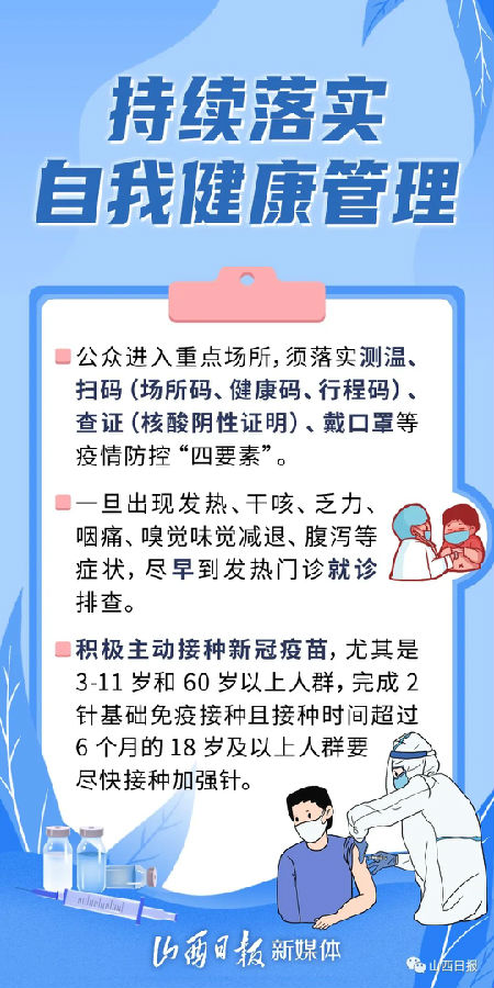 當前,國內疫情防控進入“科學精準、動態清零”階段,為進一步落實“外防輸入、內防反彈”總策略和“動態清零”總方針,持續鞏固我省疫情防控成果,維護三晉人民身體健康和正常社會秩序,山西省疾病預防控制中心健康提示如下: