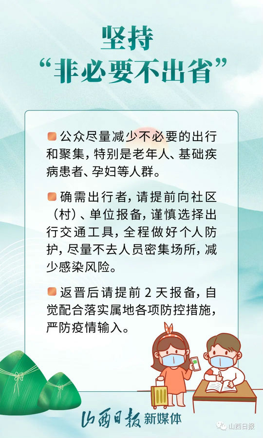 端午假期即將臨近,我省“人、物、環境”同防壓力大,疫情防控形勢嚴峻復雜。為持續堅持“外防輸入、內防反彈”總策略和“動態清零”總方針,持續鞏固我省的疫情防控成果,維護三晉人民身體健康和正常社會秩序,山西省疾病預防控制中心健康提示如下——