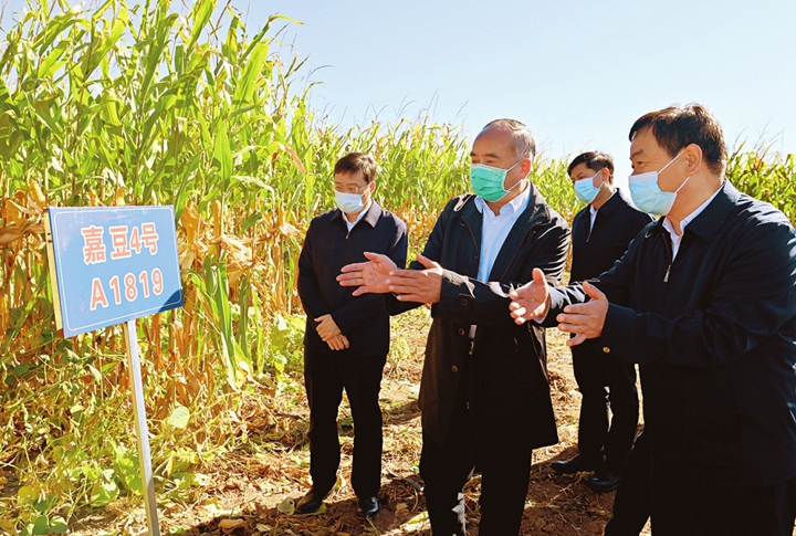 今年我省把大豆玉米帶狀復合種植作為農(nóng)業(yè)生產(chǎn)主推技術(shù),共推廣了80多萬畝,覆蓋全省近一半縣(市、區(qū))。秋糧收獲在即,帶狀復合種植模式收成如何,林武十分關(guān)心。他來到小店區(qū)西溫莊鄉(xiāng)南王名村的大豆玉米帶狀復合種植基地,詳細了解往年收成和今年情況,同基地負責人一筆一筆算成本賬、收益賬。當聽到不包括政府補貼,畝均比原來凈增加三四百元收益時,林武十分高興,連連說道“這充分說明大豆玉米帶狀復合種植是大有前途的”。秋日暖陽下,一體收割機在農(nóng)田里往來穿梭,收割、脫粒、裝袋等流程一次性完成。林武饒有興致地觀看農(nóng)機作業(yè),他指出,大豆玉米帶狀復合種植是實現(xiàn)農(nóng)業(yè)增效、農(nóng)民增收的創(chuàng)新手段。各地各有關(guān)部門要加強全周期服務,做好政策引導和培訓指導,保障農(nóng)業(yè)生產(chǎn)用水用能,加強適用型農(nóng)機農(nóng)具改進研發(fā),發(fā)展適度規(guī)模經(jīng)營,確保把這項示范推廣工程做好做扎實,讓農(nóng)民種糧能獲利、多得利。當前要做好不同大豆品種、不同套種模式、不同栽培方式下的測產(chǎn)評估工作,為指導好明年生產(chǎn)工作夯實基礎(chǔ)。
