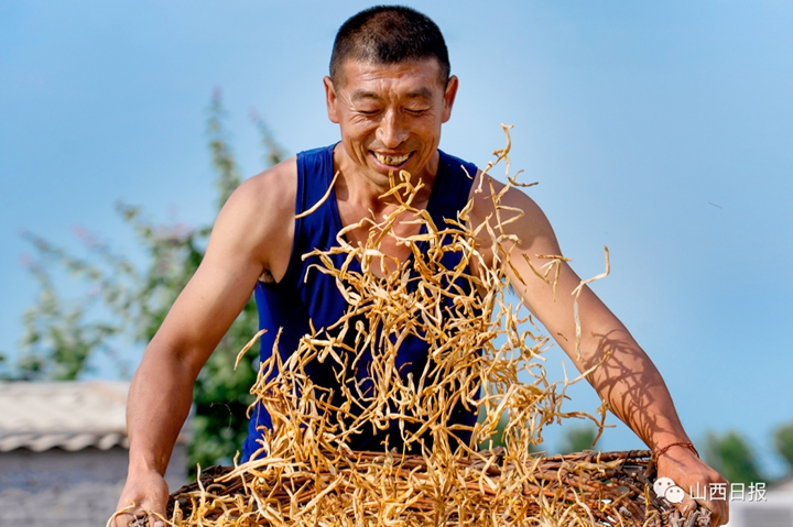 大力發展特色農業,全面推進鄉村振興。圖為2021年7月山西省大同市黃花種植戶喜獲豐收。