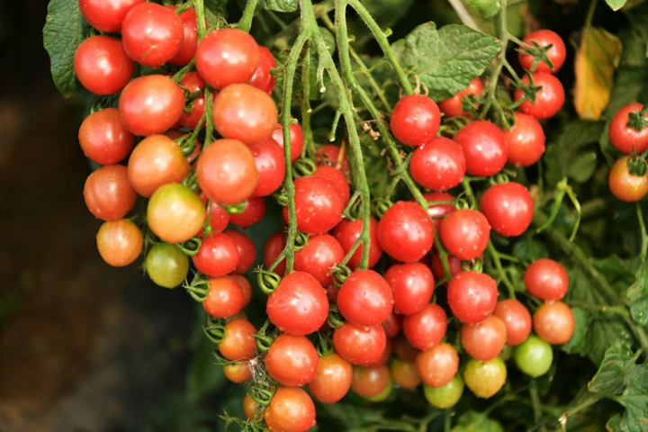 陽高縣一串串紅似瑪瑙的西紅柿懸掛在枝頭。