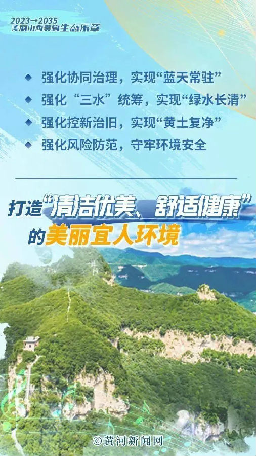 2025年山西省經濟高質量發展實現新突破,轉型發展形成重大標志性成果,美麗山西建設短板加快補齊,生產生活方式綠色轉型初見成效,生態環境質量持續好轉,生態系統質量和穩定性進一步提升,現代環境治理體系基本健全;2030年美麗山西建設成效顯著;2035年人與自然和諧共生的美麗山西全面呈現。
