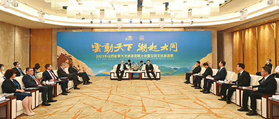 藍(lán)佛安代表省委、省政府對(duì)各位外賓表示歡迎,對(duì)大家積極推動(dòng)各國(guó)與中國(guó)及山西的友好交往表示感謝,并以早期人類故鄉(xiāng)、華夏文明搖籃、國(guó)家綜合能源基地、國(guó)家資源型經(jīng)濟(jì)轉(zhuǎn)型綜改試驗(yàn)區(qū)、夏養(yǎng)康養(yǎng)勝地“五張名片”對(duì)山西省情進(jìn)行了介紹。他說(shuō),山西歷史悠久、文化燦爛、資源豐富,在全國(guó)發(fā)展大格局中具有重要地位。近年來(lái),在以習(xí)近平同志為核心的黨中央堅(jiān)強(qiáng)領(lǐng)導(dǎo)下,山西錨定到2030年基本實(shí)現(xiàn)轉(zhuǎn)型、2035年基本實(shí)現(xiàn)現(xiàn)代化“兩個(gè)基本實(shí)現(xiàn)”的奮斗目標(biāo),勇?lián)D(zhuǎn)型發(fā)展、能源革命等重大使命,推動(dòng)經(jīng)濟(jì)發(fā)展、產(chǎn)業(yè)升級(jí)、文化繁榮、生態(tài)環(huán)保、深化改革、擴(kuò)大開放、民生保障等各方面工作取得新進(jìn)展新成效。旅游是傳播文明、交流文化、增進(jìn)友誼的橋梁。山西是文旅資源大省,厚重的歷史、燦爛的文化、壯美的山河、宜人的氣候、豐饒的物產(chǎn)和別具特色的風(fēng)土人情,為三晉大地增添了獨(dú)特魅力。希望以這次旅游發(fā)展大會(huì)為契機(jī),積極開展多種形式的文旅合作,共同舉辦豐富多彩的交流活動(dòng),讓更多外國(guó)游客開啟精彩難忘的“發(fā)現(xiàn)山西之旅”。藍(lán)佛安還向與會(huì)外賓提出深化交流合作的三點(diǎn)倡議。一是傳播山西友好聲音,積極講述山西故事、介紹山西文化、推介山西品牌,幫助提高山西在各國(guó)人民心中的知名度、美譽(yù)度,持續(xù)激發(fā)民間友好熱情。二是深化彼此交流交往,用好各方面常態(tài)化交流合作機(jī)制,深入推進(jìn)國(guó)際友城建設(shè),為共享發(fā)展機(jī)遇、共筑美好未來(lái)提供有力支撐。三是開展務(wù)實(shí)有效合作,依托共建“一帶一路”等機(jī)遇,深化能源、制造業(yè)等方面產(chǎn)業(yè)對(duì)接,強(qiáng)化經(jīng)貿(mào)、科技、教育、人文、旅游等方面交流合作,在更高層次、更寬領(lǐng)域?qū)崿F(xiàn)互利共贏。