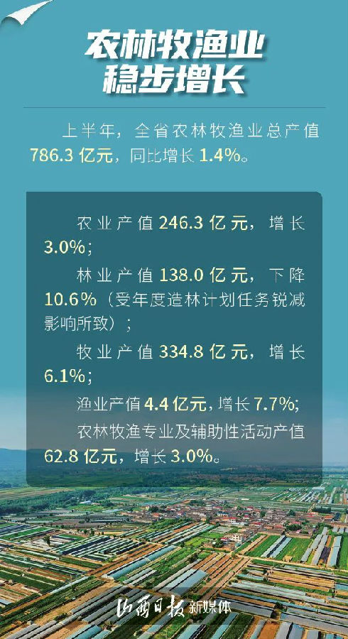 7月24日,山西省統計局發布數據,上半年,全省夏糧生產形勢良好,蔬菜生產提質增效,畜禽生產穩中向優,漁業生產健康發展,全省農業生產成效顯著。