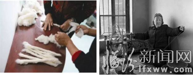 曬棉花、壓棉花、彈棉花,母親和奶奶又用高粱桿把雪白的棉花搓成一條條空心搓眼子,于是每天晚上奶奶和媽媽便用紡車紡線。后來,父親又請來汾河對岸東毛村的許師傅到家里織布。許師傅為人隨和、性格爽朗,坐在碩大的織布機上,隨著雙腳有序的踩動,右手拽繩拉梭,左手來回拉檔織布,上下錯動經緯交織,一寸寸的棉布便在織機上延長盤卷起來。