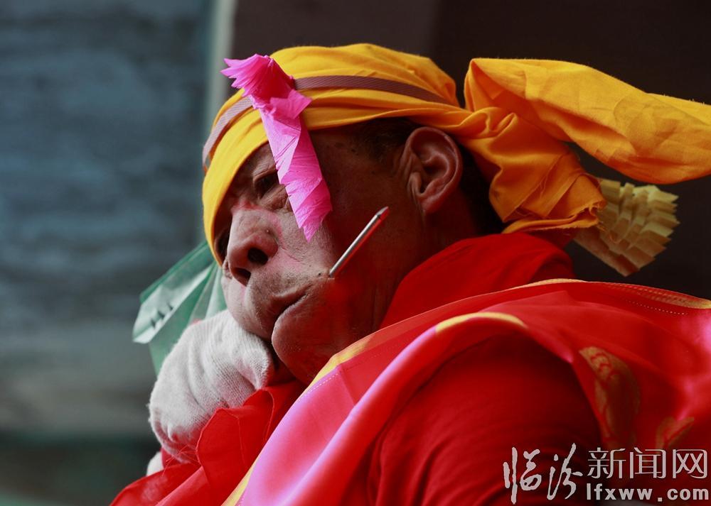 活動(dòng)分為上馬、跑馬、下馬。“上馬”指漢子們用筷子粗細(xì)的鋼釬從臉部穿過,成為“馬角神”。“跑馬”為“馬角神”邁著馬步,邊奔跑邊用麻鞭抽打眾人,驅(qū)趕邪氣、晦氣。也有家里蓋了新房,或是生了小孩,想來年保平安的鄉(xiāng)鄰,為取興頭、沾喜氣,爭(zhēng)相要求“扎馬角”一行人進(jìn)家入戶“踩院子”,給小孩“披花紅”。“下馬”指活動(dòng)結(jié)束,“馬角神”們拔掉釬子,對(duì)傷口稍作處理。整個(gè)表演將黃河沿岸人民彪悍的民風(fēng)體現(xiàn)得淋漓盡致。