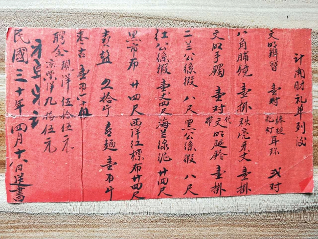 該彩禮單為紅色紙張,雖然中間有皺褶,但內容無損壞,整體保存完好。彩禮單長21厘米,寬11.5厘米,內容為毛筆書寫,字跡疏密有致,瀟灑飄逸,如同一幅精心創作的書法作品。