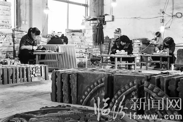 臨汾新聞網訊 近日,在襄汾縣趙康鎮牛席村仿古工藝廠,工人師傅們正在認真制作磚雕作品。該廠生產制作的磚雕做工細膩、構圖精美、栩栩如生,遠銷北京、廣東等地。圖為磚雕師傅正在加工磚雕。