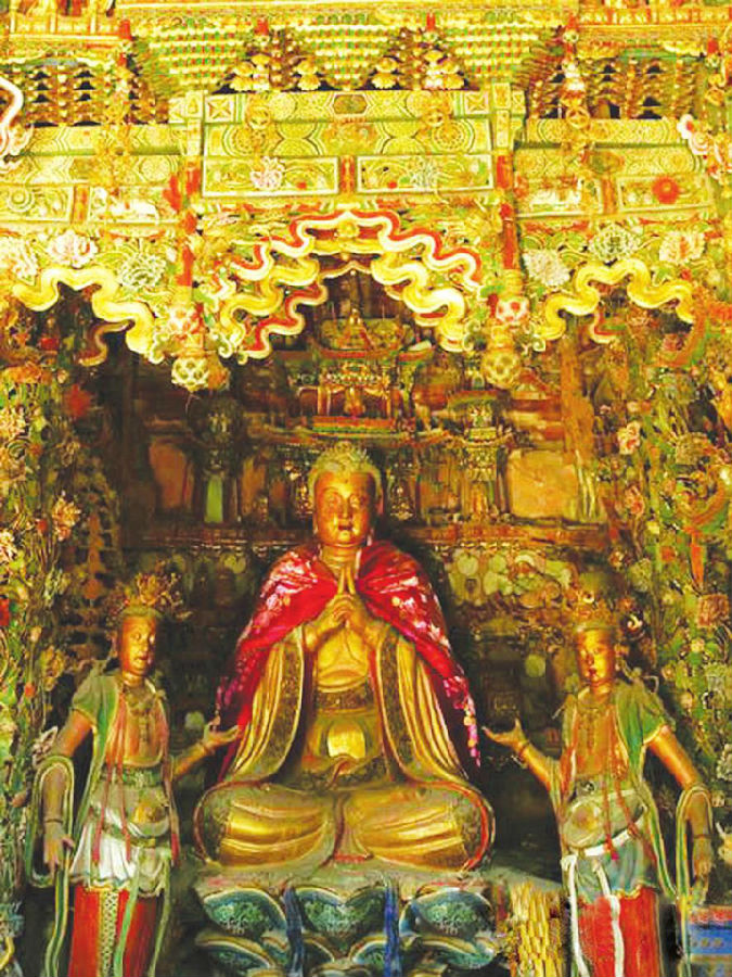 這些彩塑姿態(tài)各異、造型生動,置身千佛國的殿堂樓閣之中。高者達3米多,小者僅有拇指大小,繁而不雜、靡而不亂,井然有序地表達著佛教的大千世界。在國內(nèi)的許多名山古剎中,雖不乏各種類型的懸塑,但無一處如小西天之紛繁華艷,無一處如小西天之精美絕倫。