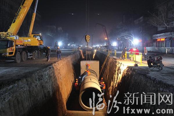凌晨1點,記者在市區堯豐市場附近的施工現場看到,沿線開挖好的管溝附近集結滿了大型吊裝機械,正在吊裝管道。