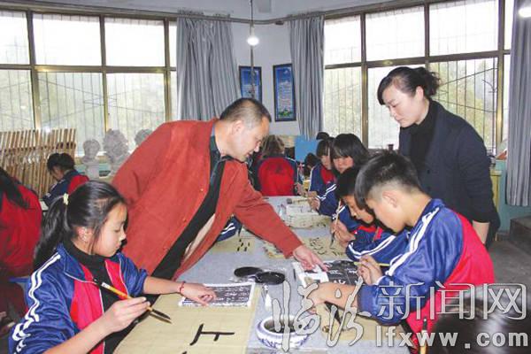 金殿二中校長賈銀鎖說:“從去年9月份開始,學(xué)校開設(shè)了音樂、美術(shù)、書法(硬筆)、體育(健美操)、物理化學(xué)實(shí)驗(yàn)操作和閱讀6個(gè)興趣活動(dòng)小組。今年暑假,就讀于中國藝術(shù)研究院中國書法院研究生課程班的李琰老師提議:書法課程應(yīng)納入九年義務(wù)教育。緊接著,學(xué)校布置教室,購置書法用品,設(shè)置專門的書法課堂,投入了大量人力和物力。9月份一開學(xué),學(xué)校考慮到農(nóng)村家庭條件有限,在開設(shè)毛筆書法興趣小組的同時(shí),為初一、初二近20名學(xué)生免費(fèi)提供所有書法用品用具。”