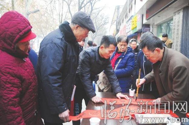 臨汾新聞網訊 1月10日上午,堯都區迎春北街臨汾莉軼糖尿病醫院門口,我市十余名書法家現場揮毫潑墨,為前來就診的患者義務書寫春聯,為他們提前送上節日的祝福。