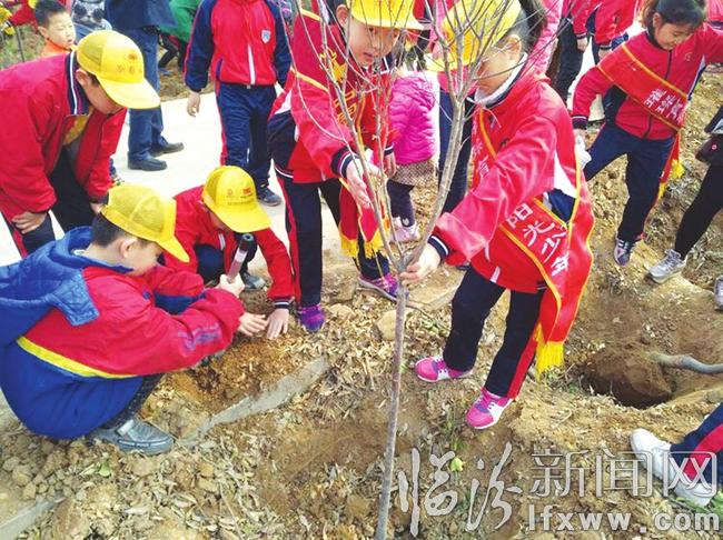 當天,該班50名學生在老師和家長的幫助下,栽下了一棵棵小樹苗,并將提前寫有祝福和心愿的心語卡片掛在小樹苗上。 記者郭秀婷攝