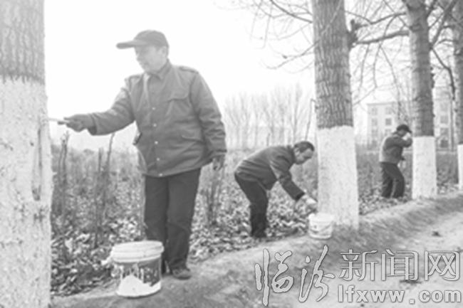 臨汾新聞網訊3月19日,堯都區堯廟鎮杜村的工作人員走上街頭為樹木刷石灰粉。樹木進行石灰粉刷白養護,可消滅在樹木縫隙中的病蟲及其蟲卵,起到保護樹木生長、美化環境的效果。