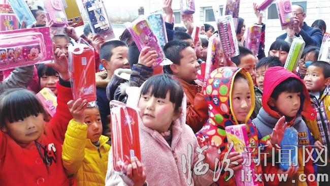 幼兒中班的妞妞,領到的禮物是一只毛茸茸的浣熊,她抱著浣熊高興地說:“太好了,我最喜歡小熊了。”一年級的鵬鵬則奶聲奶氣地說:“我的文具盒上有葫蘆娃,我要學習葫蘆娃的堅強勇敢,好好學習、天天向上。”諳正村小學校長賈曉龍說,孩子們聽說今天師大臨汾學院藝術系的大哥哥、大姐姐們要來,可高興了,一大早就來到學校眼巴巴地等著。孩子們遇到了好時候,那么大的毛絨玩具,我們小時候見都沒見過。孩子們今天領到的筆袋真好又實用,說真的,作為一校之長,我都沒有那么好的一個筆袋。說著,賈曉龍的眼睛里滿是感激。