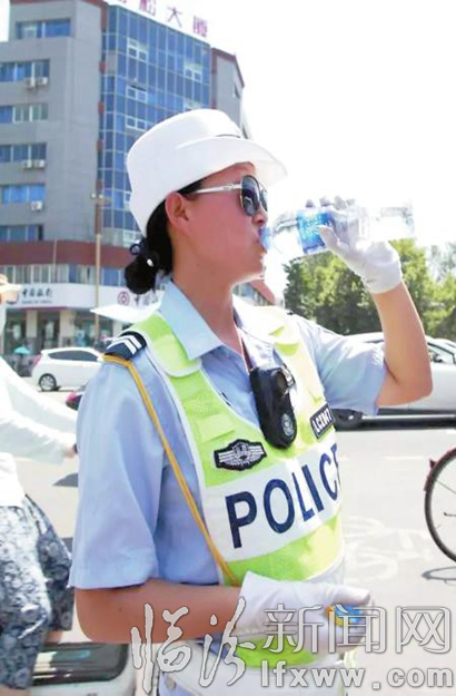 在高溫天氣下工作,對交警來說,唯一能緩解的只有不停地喝水,但礦泉水在高溫下也變成了熱水。