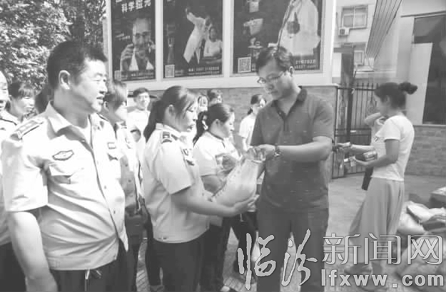 臨汾新聞網訊 8月4日上午,堯都區車站社區志愿者和勝杰齒科醫院、同仁眼科醫院、堯都區貝爾迪幼兒園的工作人員為環衛工人送來清涼祝福,感謝他們在炎炎夏日為根治城市“牛皮癬”和城市衛生付出的艱辛勞動。