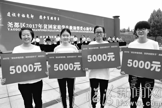 臨汾新聞網訊 日前,堯都區舉行2017年“建設幸福堯都·圓夢貧困學子”貧困家庭學生救助暨愛心助學大會。來自市、區的60余家企業單位和愛心人士,以及全區廣大干部職工參加了捐助,總共籌得善款383余萬元,現場為65名受助學生代表發放了助學金。