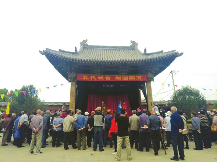 魏村牛王廟戲臺建于元至元二十年(1283年),戲臺呈平面正方形,為典型的單檐歇山頂建筑。四角立柱,前兩根為抹角石雕,臺周三面敞朗,臺上無前后之分,頂部為精構巧架的藻井,整個建筑精巧別致,古樸典雅,是我國現存最久遠的元代戲臺。如今,古戲臺受到文物部門的重點保護,廟會期間的戲曲表演大多在現代舞臺進行,只有農歷四月初十這天,在魏村文物管理所及當地村民的聯合保護下,才會在古老的戲臺上唱一段傳統戲曲,讓群眾感受古老戲臺和傳統戲曲的魅力。