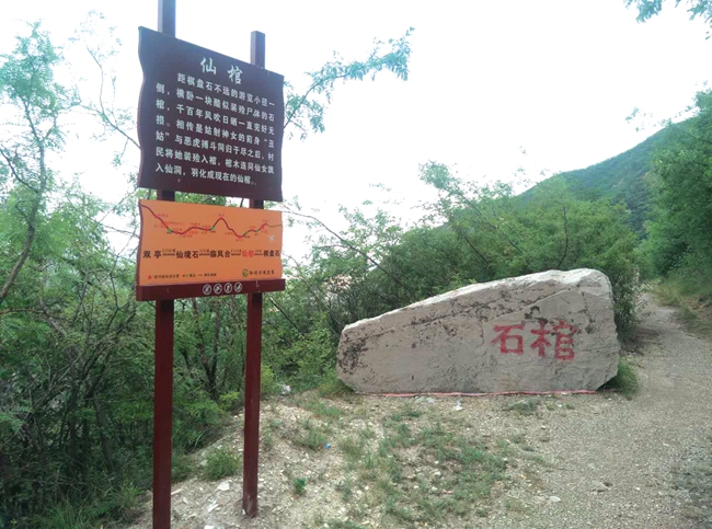 “仙棺”景點位于仙洞溝景區(qū)華北第一大嶂谷的溝邊,離著名景點“棋盤石”不遠。“仙棺”為一整塊石頭,一頭粗、一頭細,大小形狀及上邊天然巖石紋理構(gòu)成的“棺材板”與棺材十分相似。又因“丑姑射虎”的故事,這處景點被賦予更多的文化內(nèi)涵和神秘色彩。