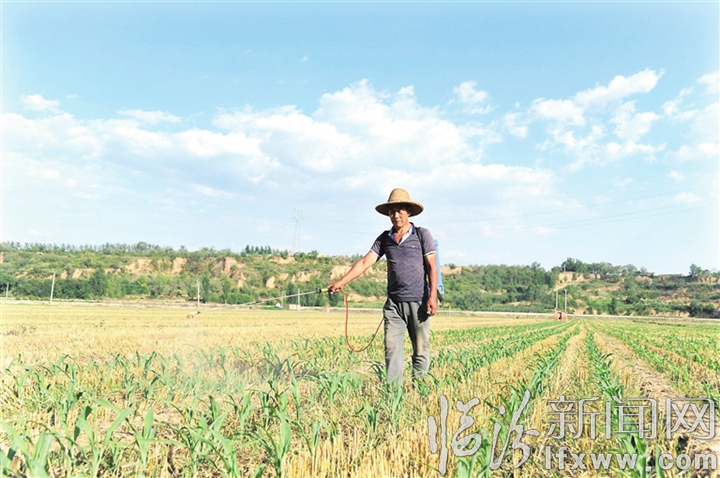 臨汾新聞網訊 7月6日,在翼城縣唐興鎮城南村,村民頂著烈日給“回茬套種”玉米噴灑農藥。