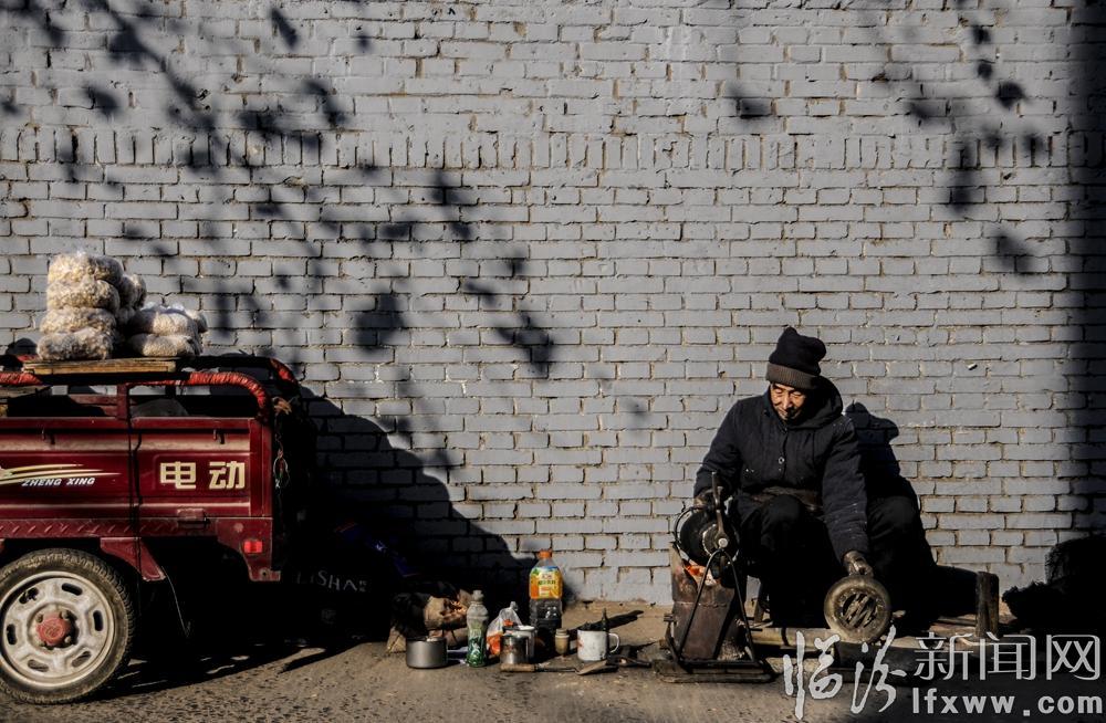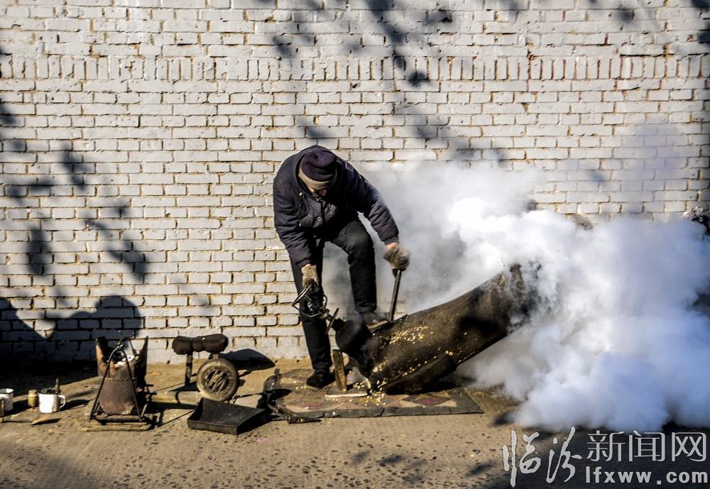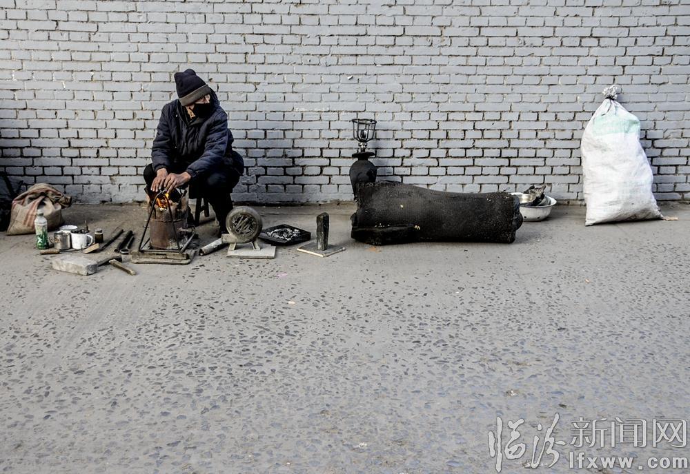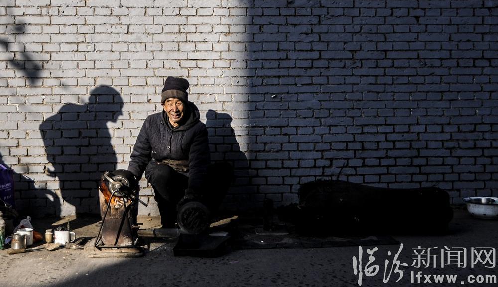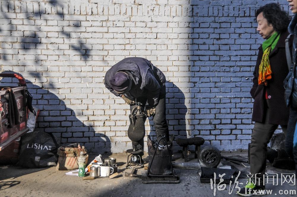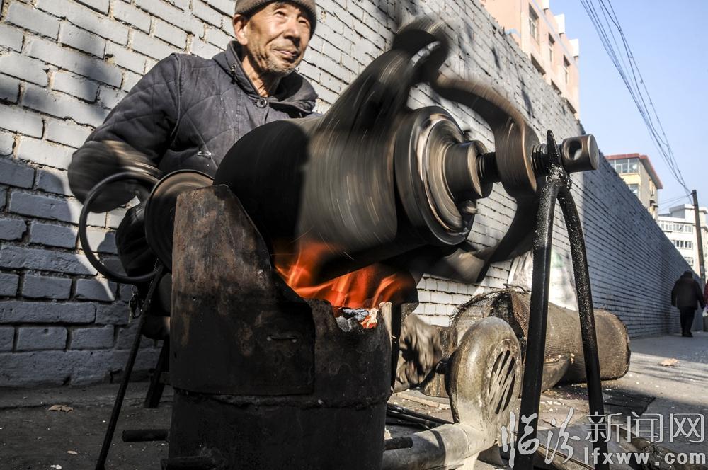 1月12日,堯都區印染巷中段十字路口,老行當手藝人喬師傅又開始了新一天的生活。一輛推車、一團爐火、手搖吹風機、一口葫蘆狀的爆米花機,這是喬師傅每天出門必帶的家當。